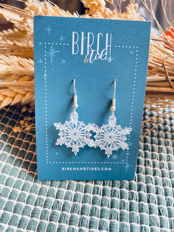 Celebrate the holiday season with our delicate engraved snowflake earrings, made using 1.5mm acrylic to keep these as light as possible. Sized to 2.8cm made using hyper-allergic sterling sliver hooks